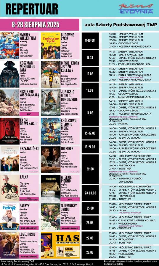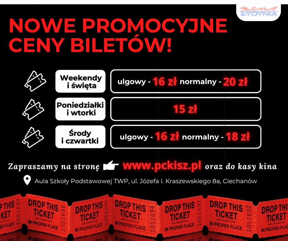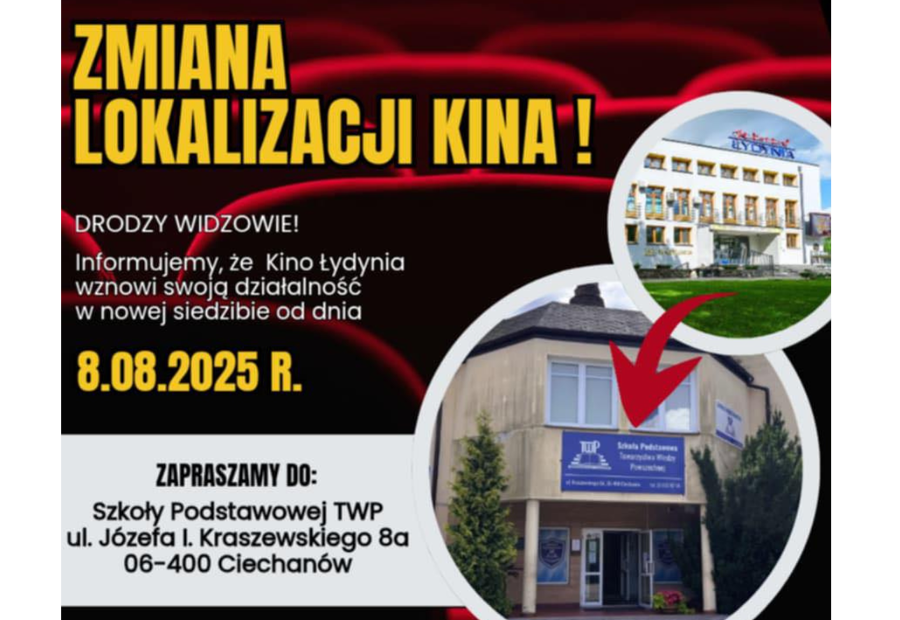 Powiatowe Centrum Kultury i Sztuki w Ciechanowie zaprasza do nowej lokalizacji kina, które zostanie otwarte 8 sierpnia w Szkole Podstawowej TWP. Komfortowa sala na 200 miejsc oraz promocyjne ceny biletów (np. 15 zł w poniedziałki i wtorki) czekają na miłośników filmów. Repertuar na sierpień dostępny w galerii. Zapraszamy na seanse!