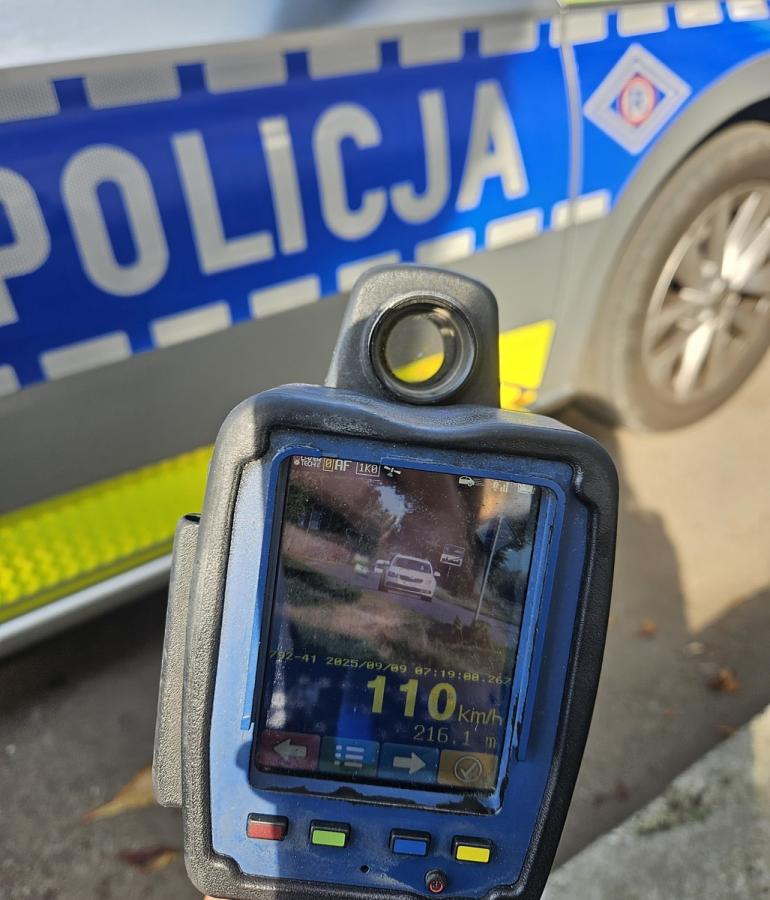 Galeria zdjęć przedstawiająca kontrolę drogową w Nużewku, gdzie kobieta kierująca skodą została zatrzymana za nadmierną prędkość. Mimo ograniczenia do 50 km/h, na liczniku miała 110 km/h. Skutkiem tego jest utrata prawa jazdy na 3 miesiące, mandat 1500 złotych i 13 punktów karnych.